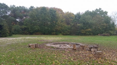 Kampvuurkring met uitzicht op de speelweide en het speelbos.